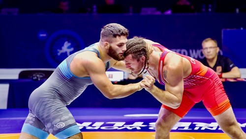 (Turpal Bisultanov mod Zurabi Datunashvili I VM finalekampen i 2022. Foto: Danmarks Brydeforbund)
