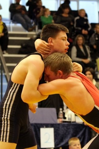 På billederne ses: finalen mellem BK Thors Christian Christensen (blå trikot) og Emil Birkshøj (rød trikot) i 63 kg.
