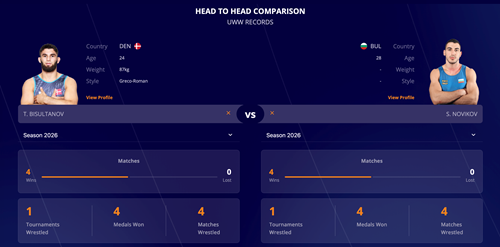 Når Turpal Bisultanov går på måtten i EM-finalen mod Semen Novikov, bliver det et opgør mellem to brydere med markant forskellige styrker og stilarter. Statistikken fra United World Wrestlings head-to-head-data tegner et billede af en finale, hvor offensiv aktivitet møder taktisk kontrol.